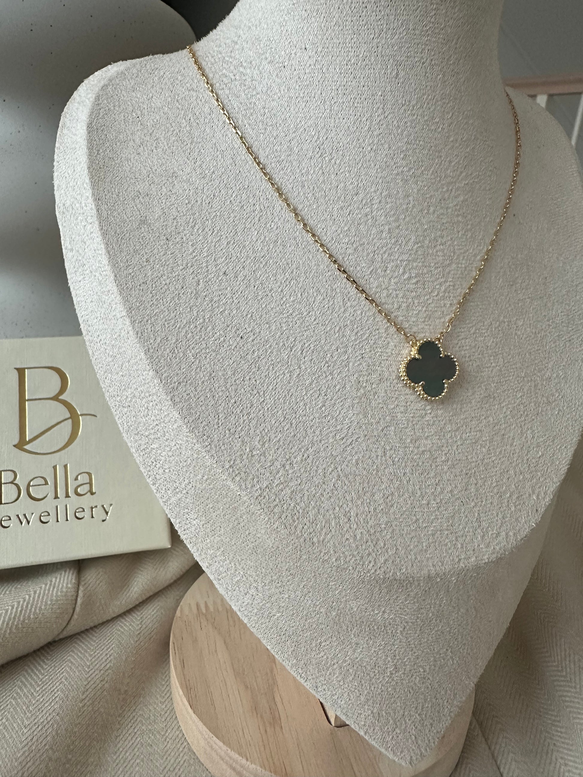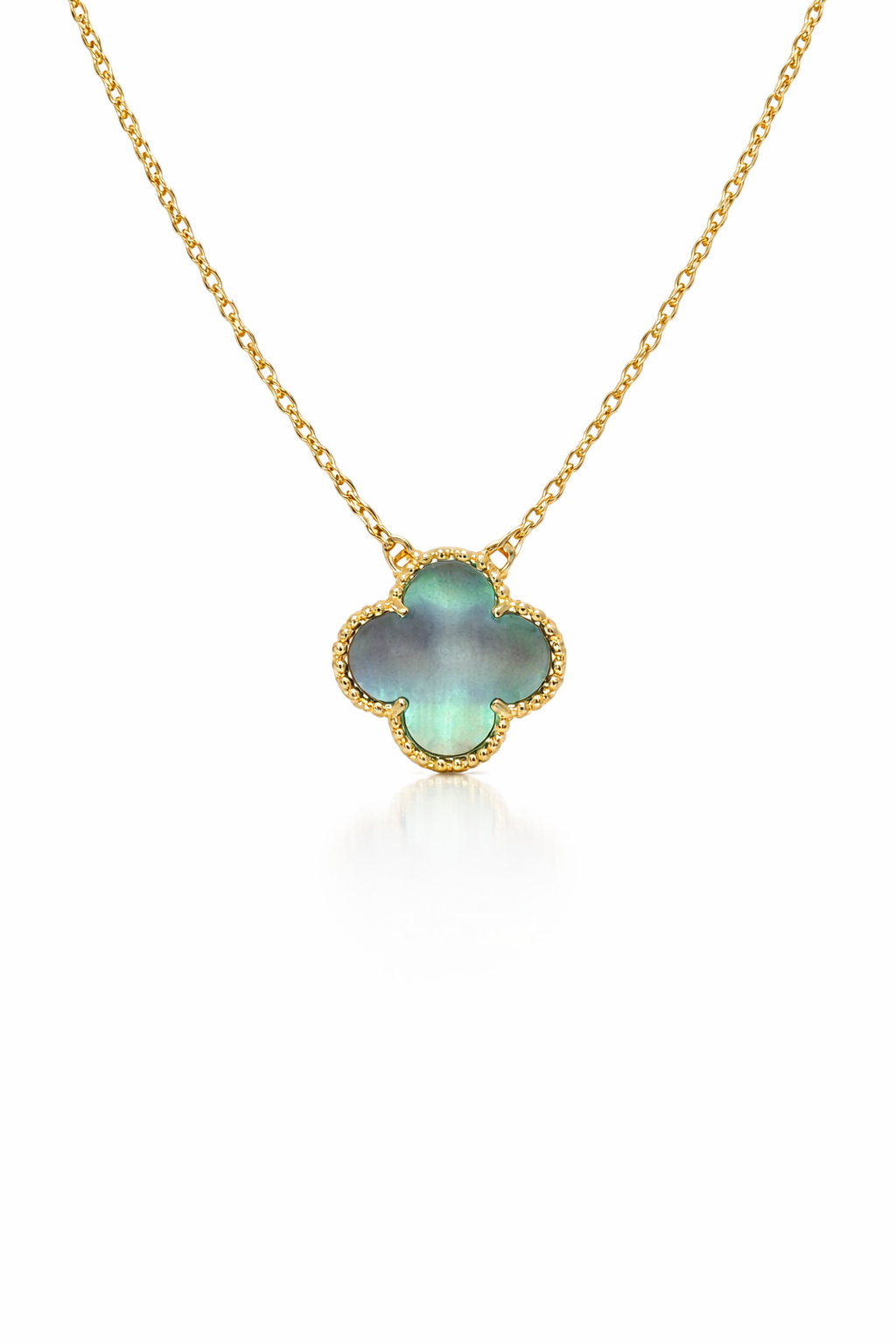 Aurora Clover halskæden er et elegant og tidløst smykke med en smuk grågrøn perlemorseffekt, der changerer naturligt i lyset. Det firkløverformede vedhæng er indrammet i en fin guldfarvet kant, som giver et luksuriøst og feminint udtryk.