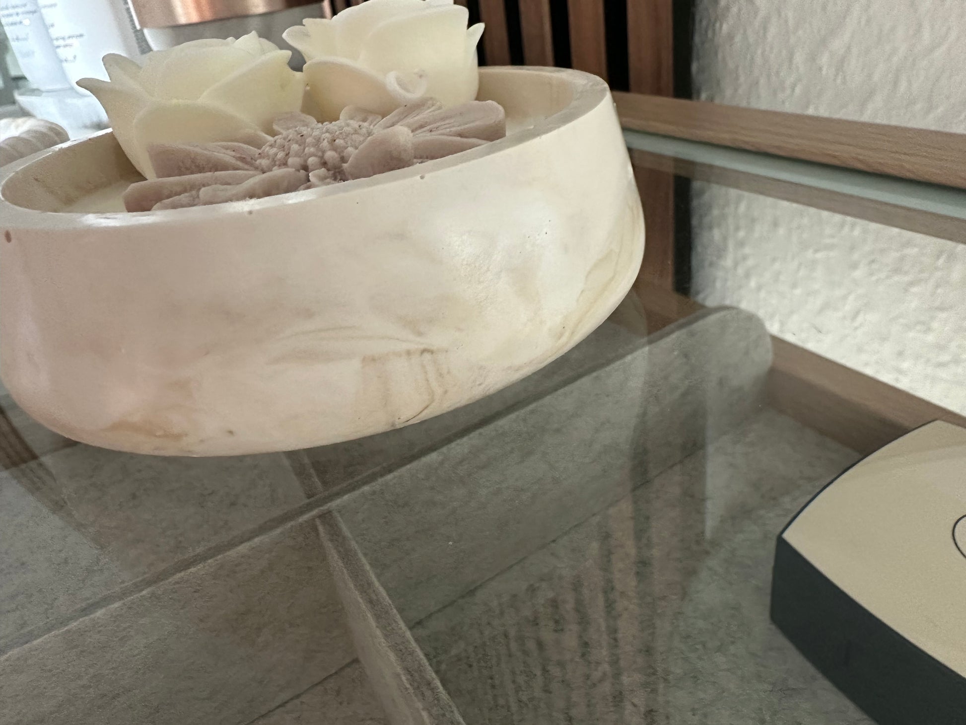 håndlavede stearinlys er støbt i en elegant skål og dekoreret med fine blomsterdetaljer - kommer med vanilje duft