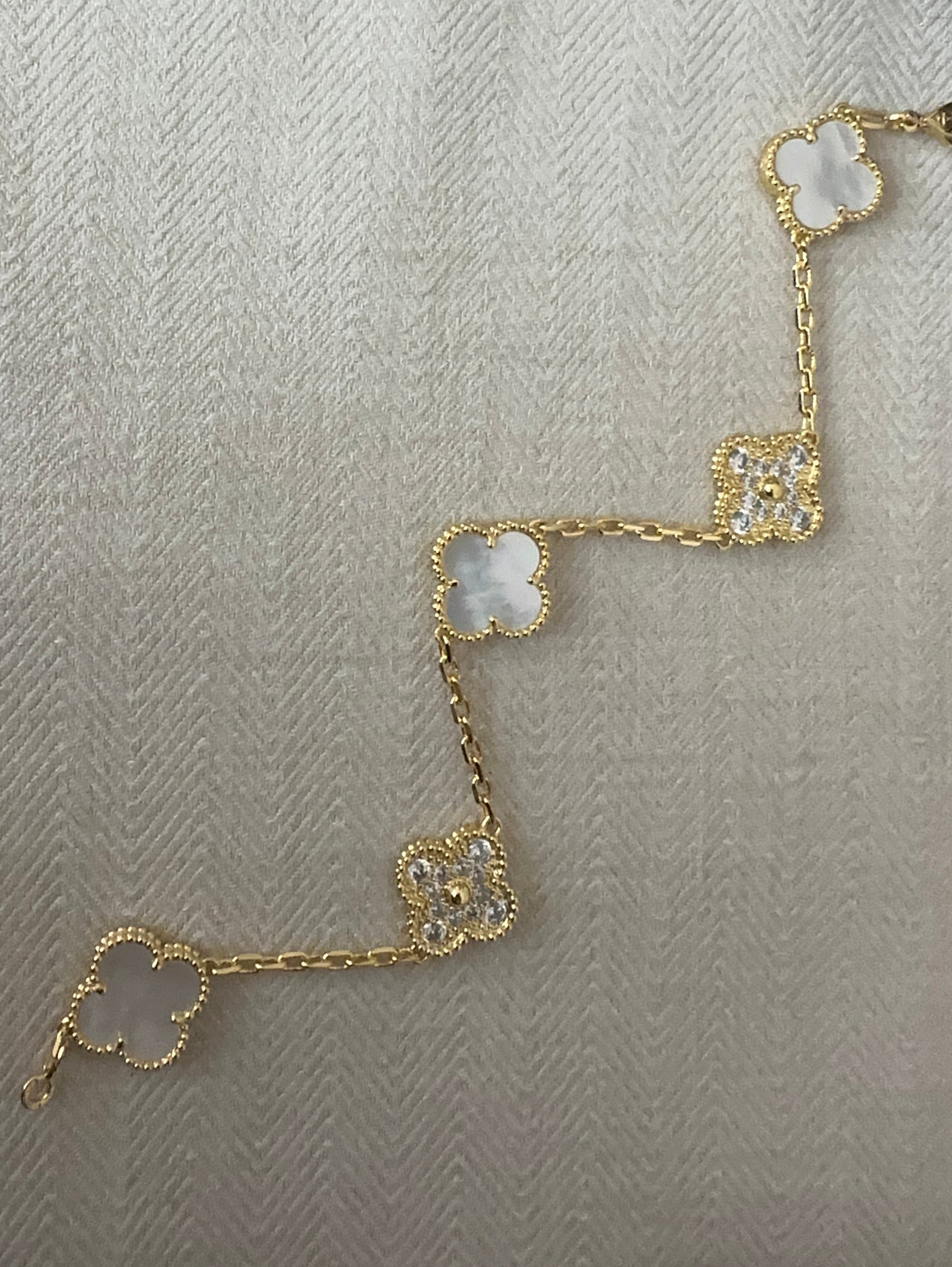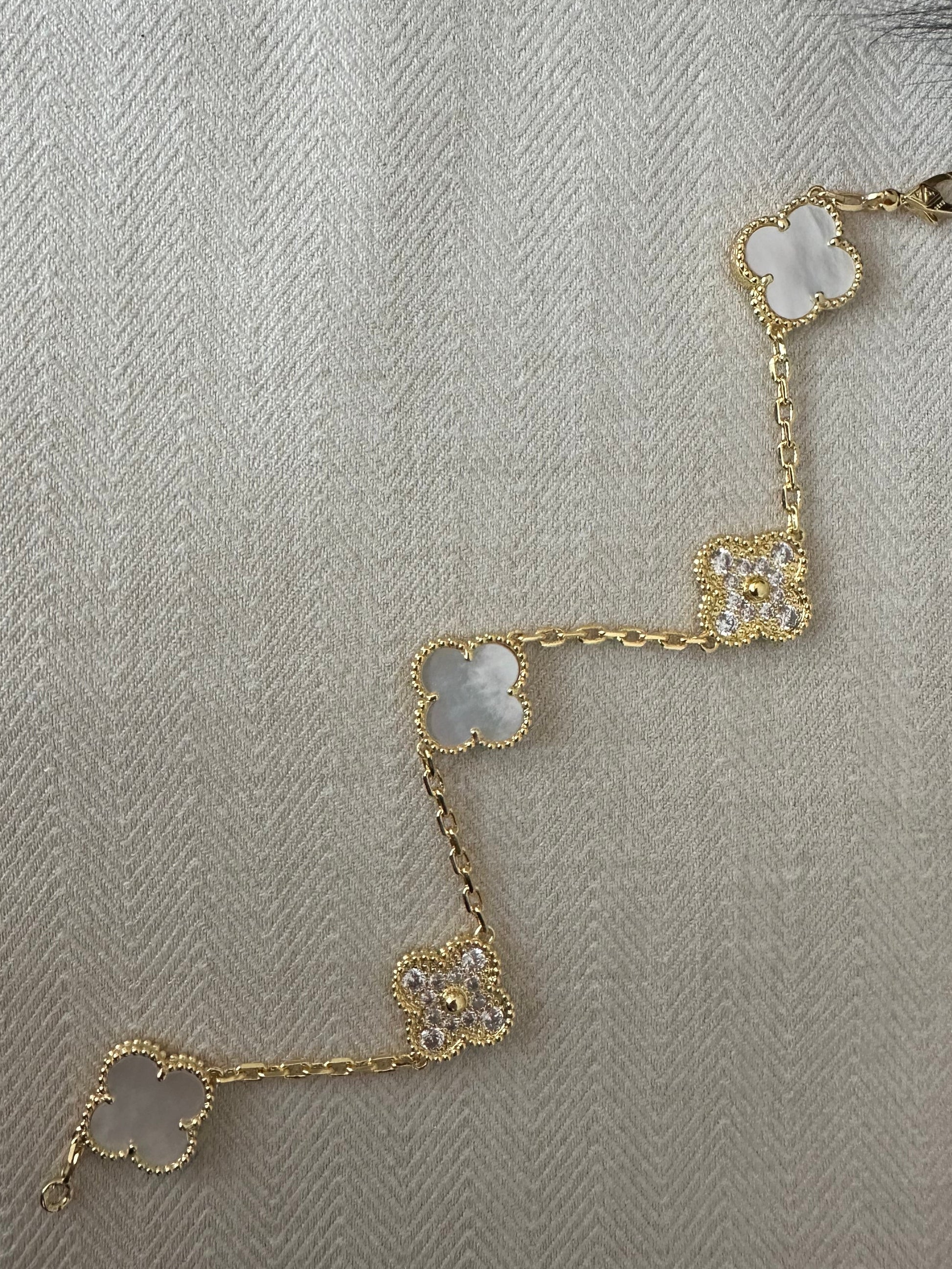 Elegant armbånd med fine blomsterformede vedhæng i klassisk hvid nuance kombineret med funklende klare sten, som giver et eksklusivt og feminint udtryk. Det lette design gør armbåndet behageligt at bære hele dagen og perfekt til både hverdag og fest. Længde: 19 cm.