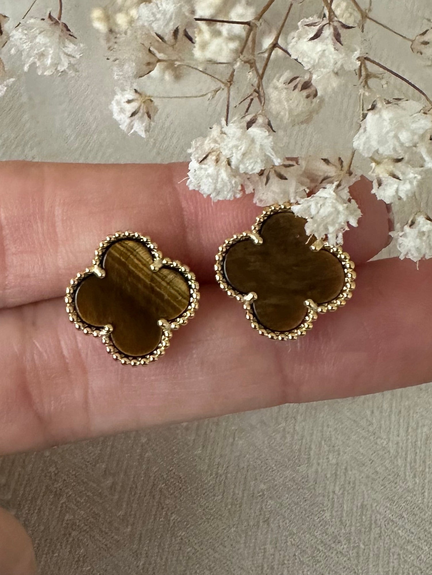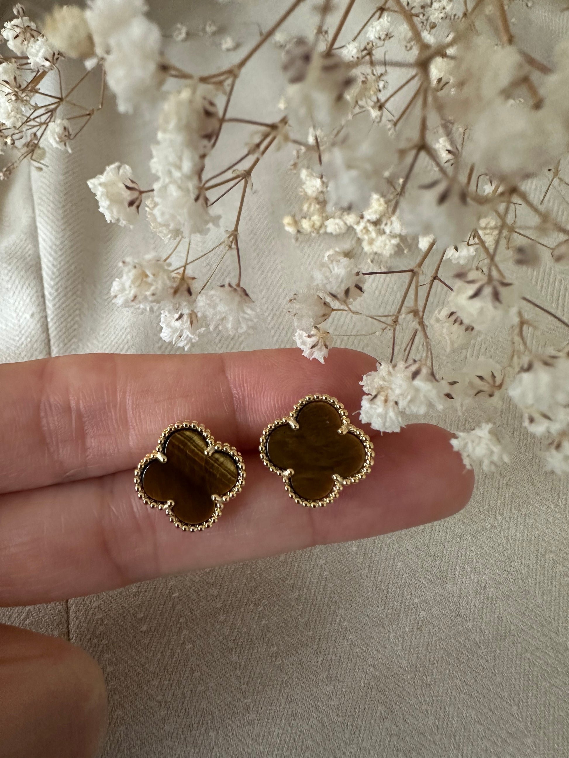 Ørestikker er elegante guldfarvede øreringe formet som fine kløvere/blomster med en smuk brun perlemorsfinish, der changerer flot i lyset. Den varme nuance kombineret med den dekorative guldkant giver et eksklusivt og sofistikeret look.