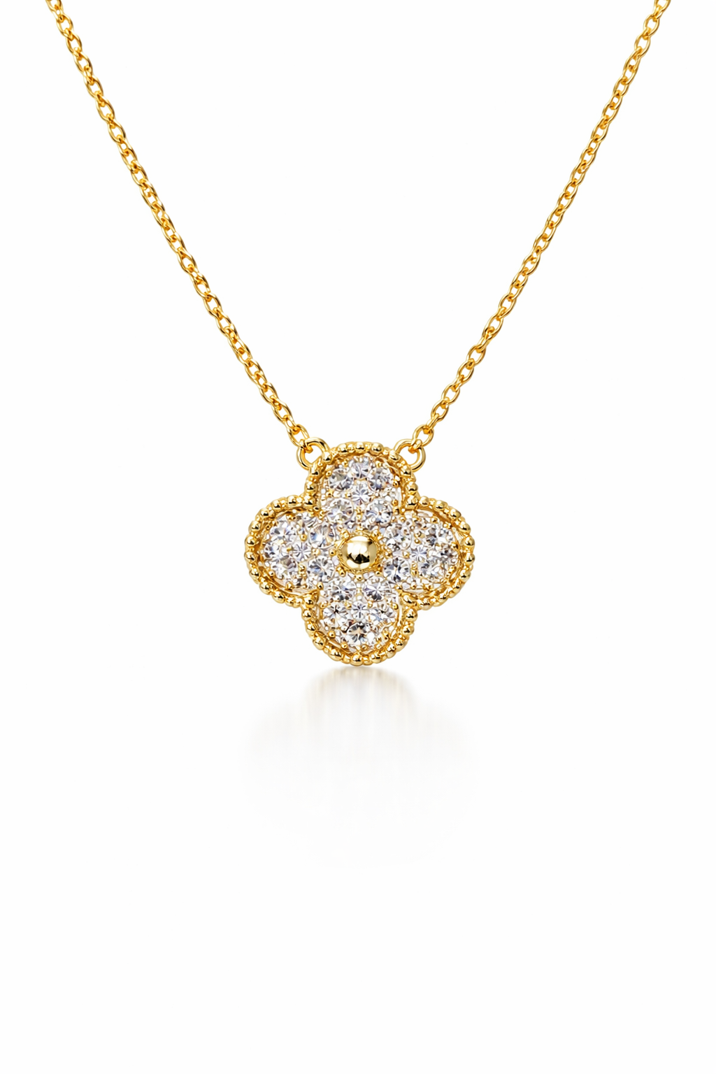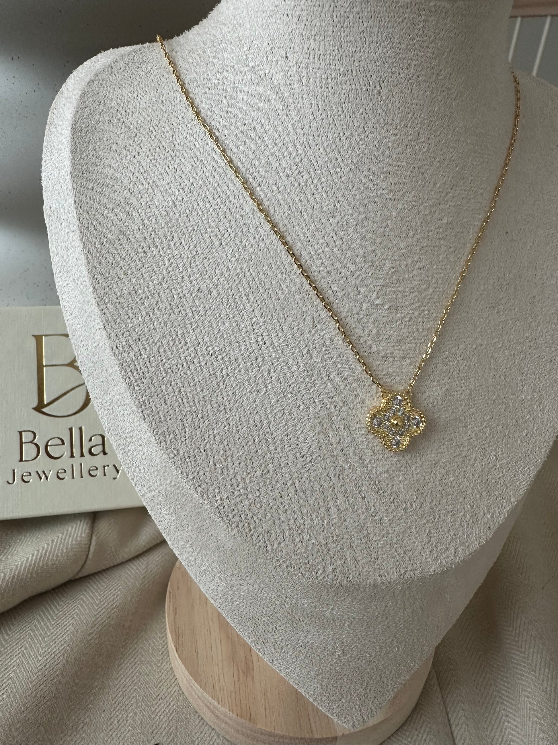 Diamond Clover Halskæde er en elegant guldfarvet halskæde med et smukt kløverformet vedhæng besat med funklende klare sten, der reflekterer lyset smukt fra alle vinkler. Den fine guldkant giver et eksklusivt og feminint udtryk, perfekt til både hverdag og festlige anledninger.