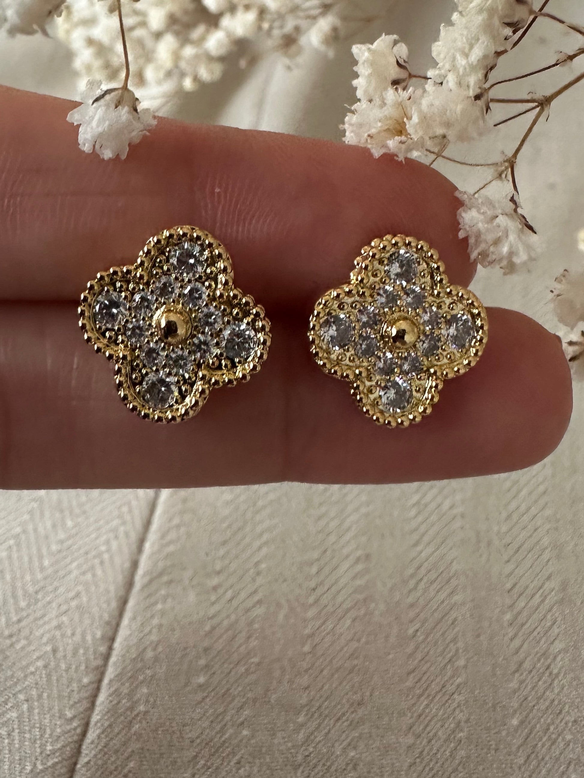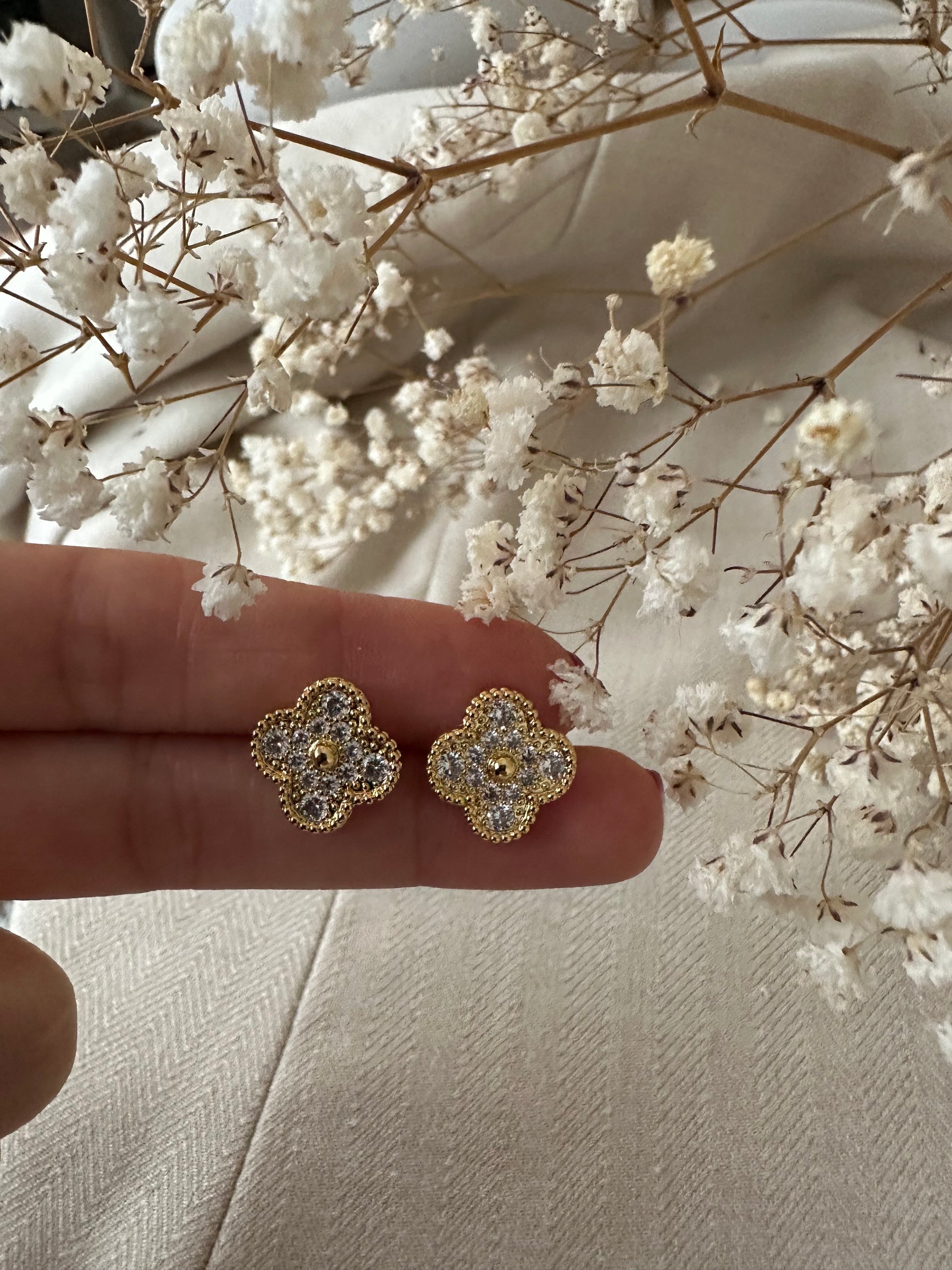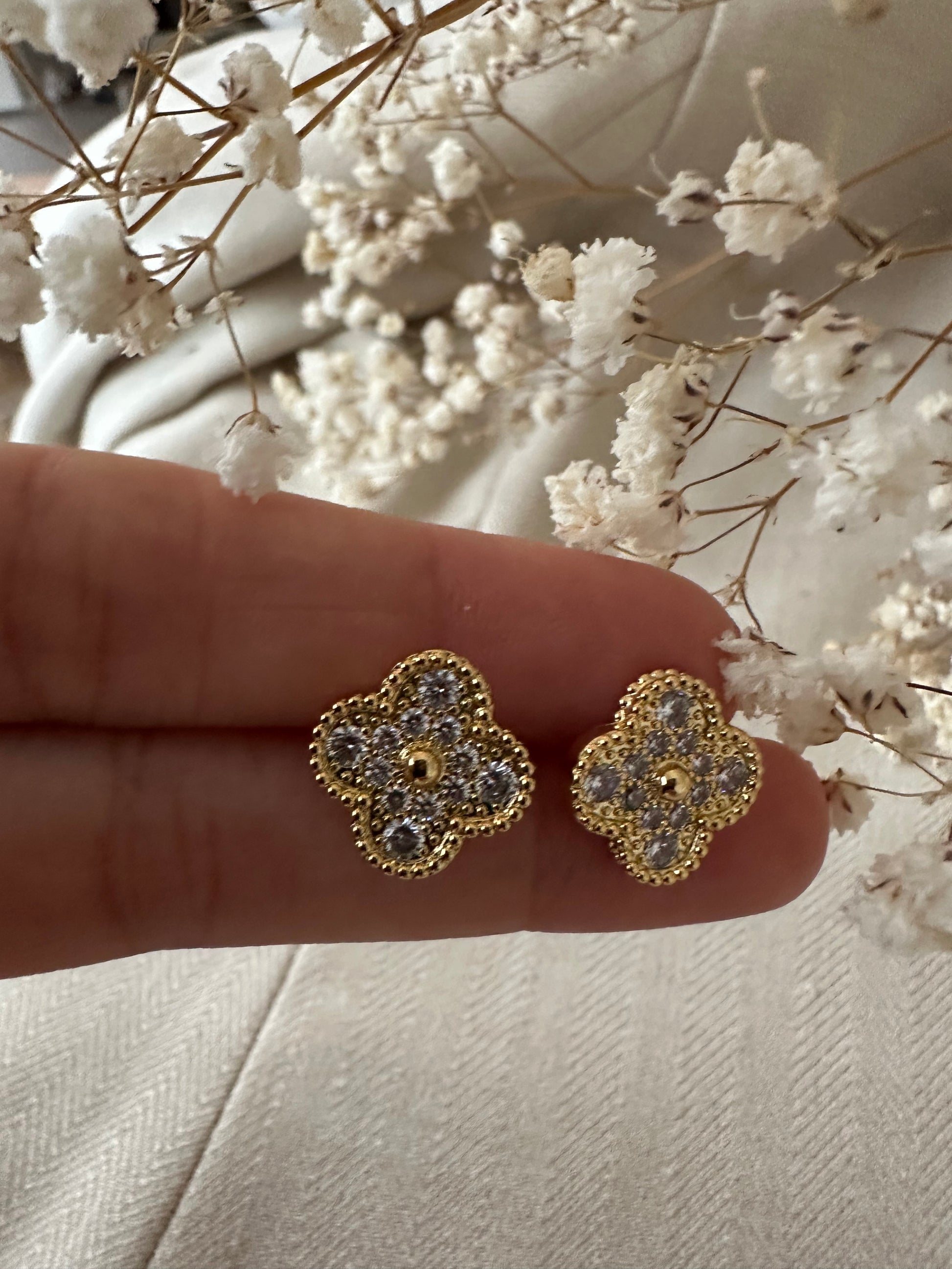 Crystal Clover Ørestikker er smukke guldfarvede øreringe formet som fine kløvere/blomster, dekoreret med funklende sten der giver et eksklusivt og glamourøst look. Den detaljerede guldkant skaber dybde og elegance, mens de klare sten fanger lyset fra alle vinkler.