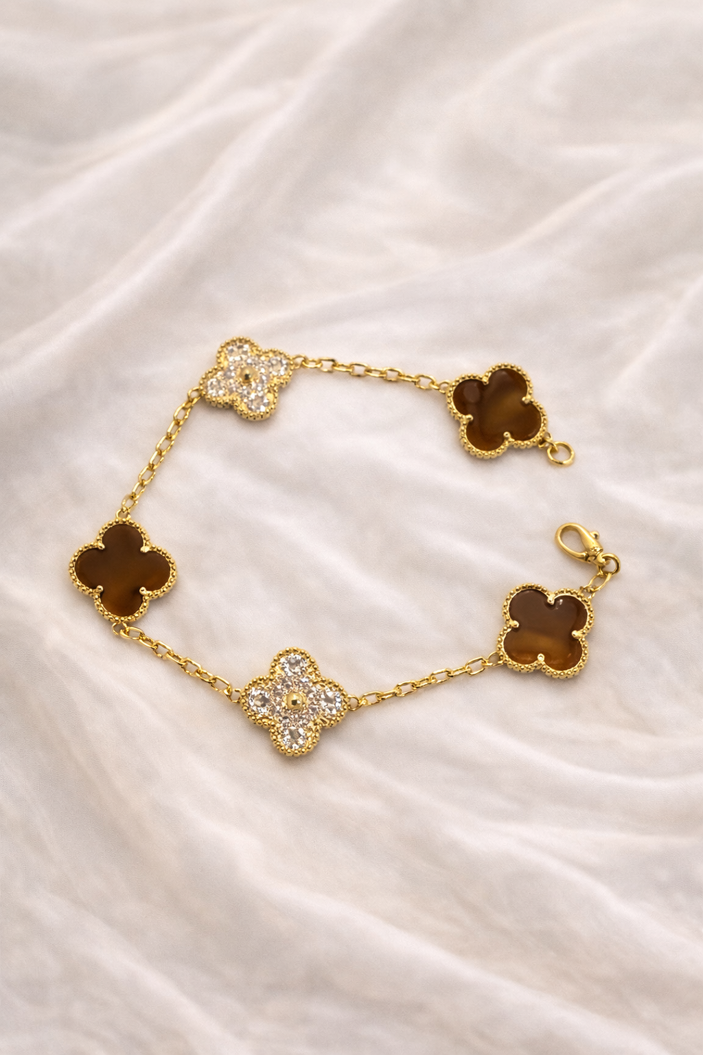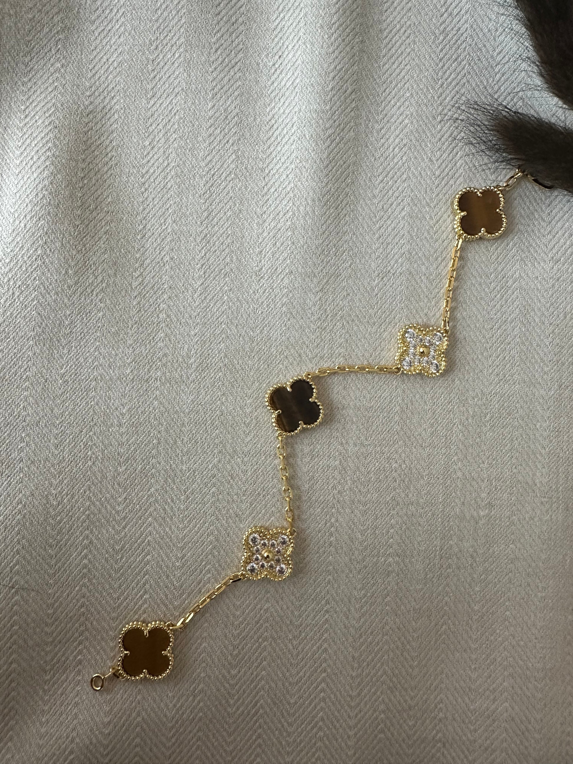 Smukt guldbelagt armbånd med fine blomsterformede vedhæng i varm brun nuance kombineret med funklende sten, der giver et eksklusivt og feminint look. Det lette design gør armbåndet behageligt at bære hele dagen og perfekt til både hverdag og fest. Et tidløst smykke, der tilfører elegance til ethvert outfit.
