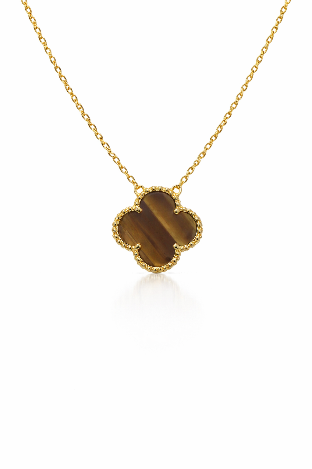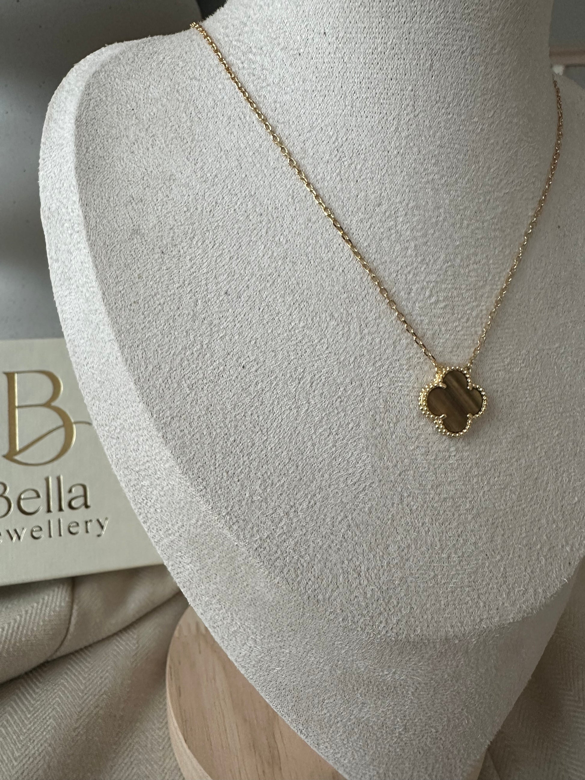 Mocha Pearl Clover Halskæde er en smuk guldfarvet halskæde med et kløverformet vedhæng i varm brun perlemorsfinish, der giver et eksklusivt og sofistikeret udtryk. Den dekorative guldkant indrammer perlemoren perfekt og skaber et tidløst design, der passer til enhver stil.