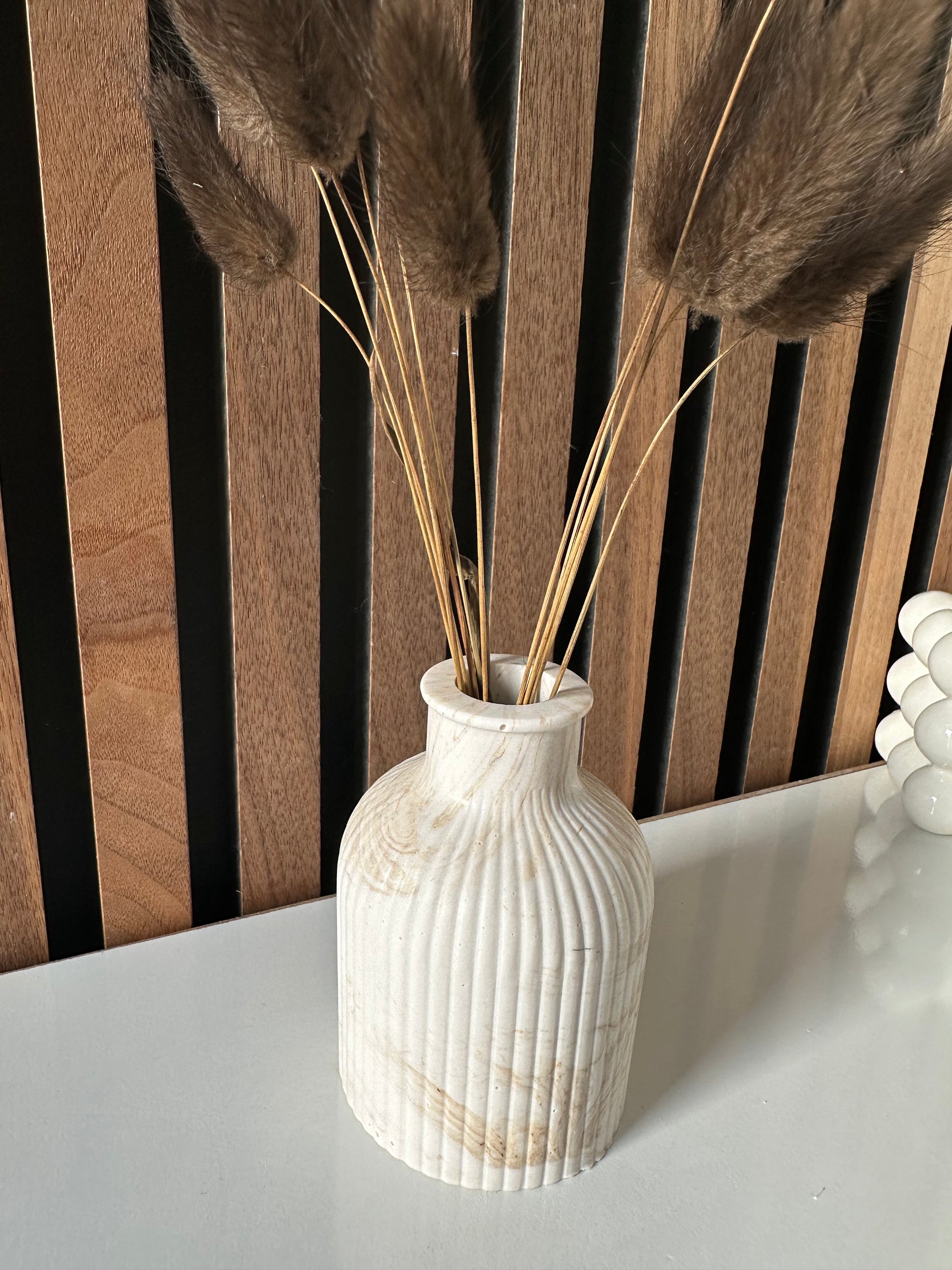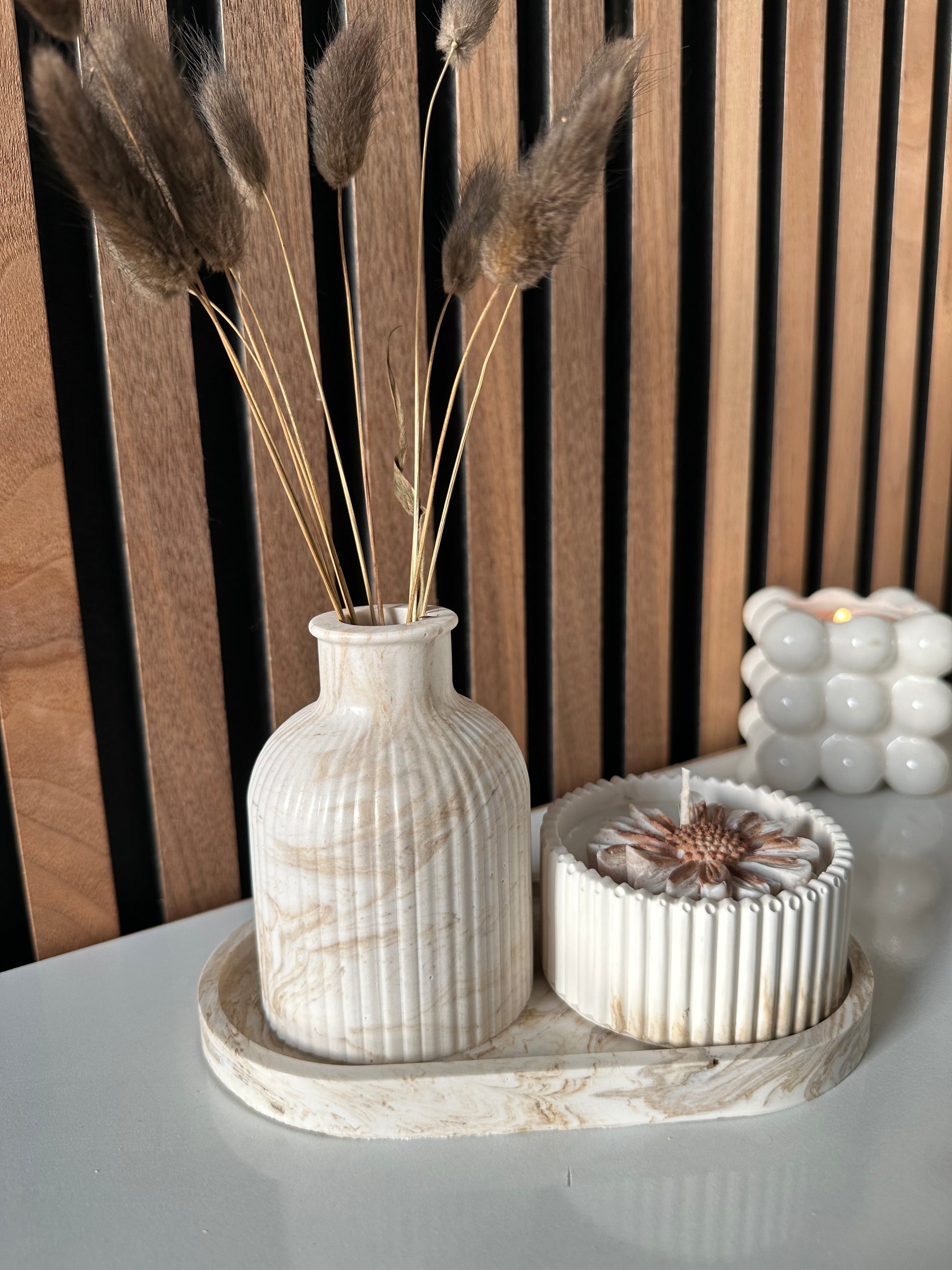Skab en rolig og elegant stemning i dit hjem med Nordic Calm dekorationssættet. Sættet består af 3 dele: en stilren riflet keramikvase, et dekorativt stearinlys i matchende design samt en elegant plade, der samler udtrykket.