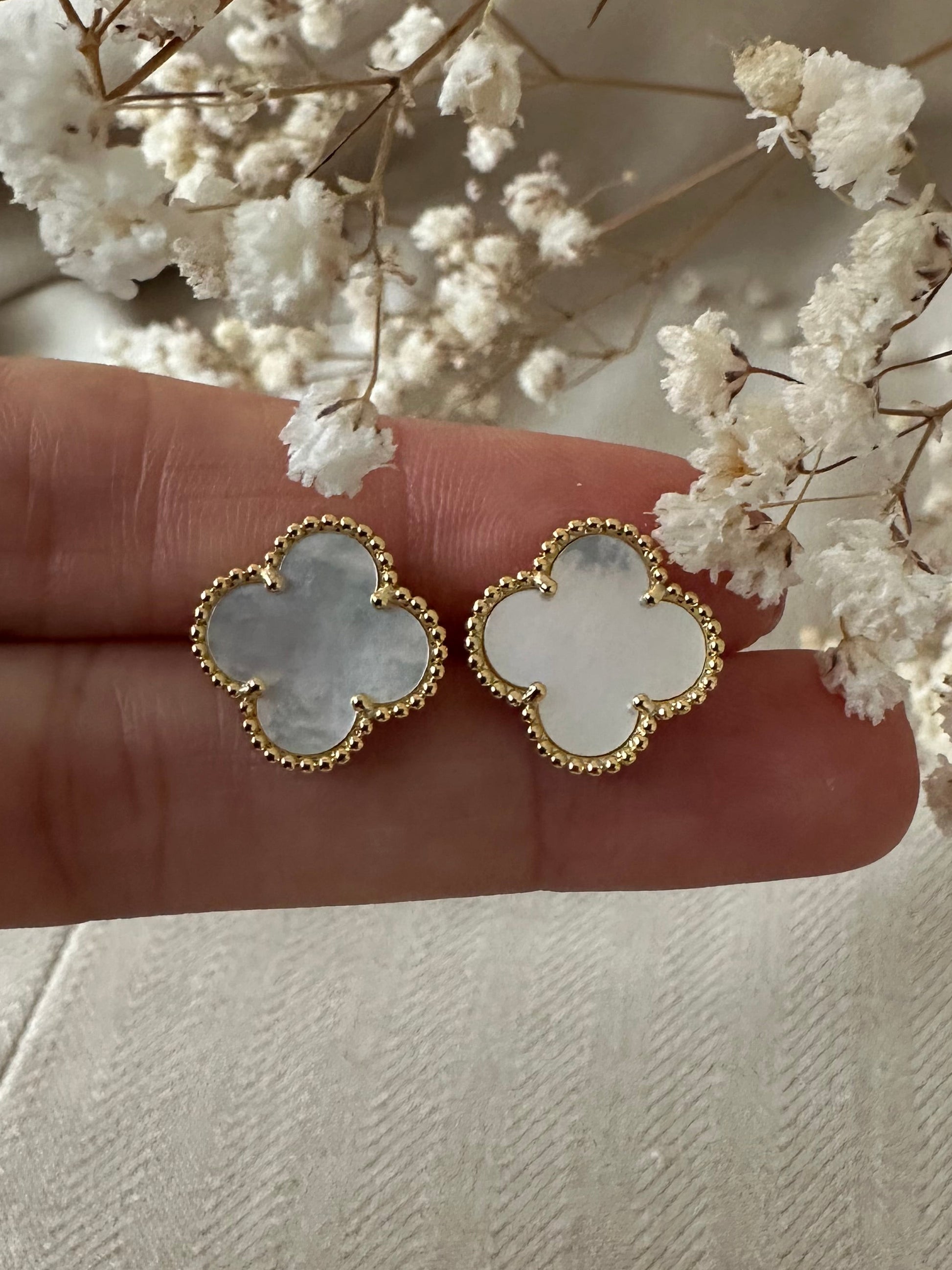 Pearl Clover Ørestikker er elegante guldfarvede øreringe med smuk perlemorsfinish formet som fine blomster/kløvere. Den blanke guldkant giver et eksklusivt look, mens den lyse midte skaber et blødt og feminint udtryk.