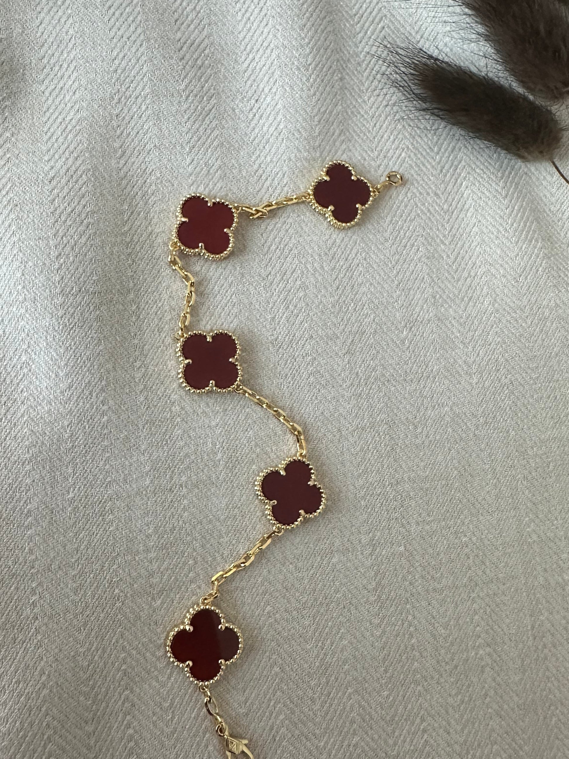Smukt armbånd med blomsterformede vedhæng i dyb pador-rød nuance, der giver et luksuriøst og feminint udtryk. Det fine guldlook kombineret med den varme røde farve skaber et elegant smykke, som passer perfekt til både hverdag og fest. Armbåndet er 19 cm langt og behageligt at bære