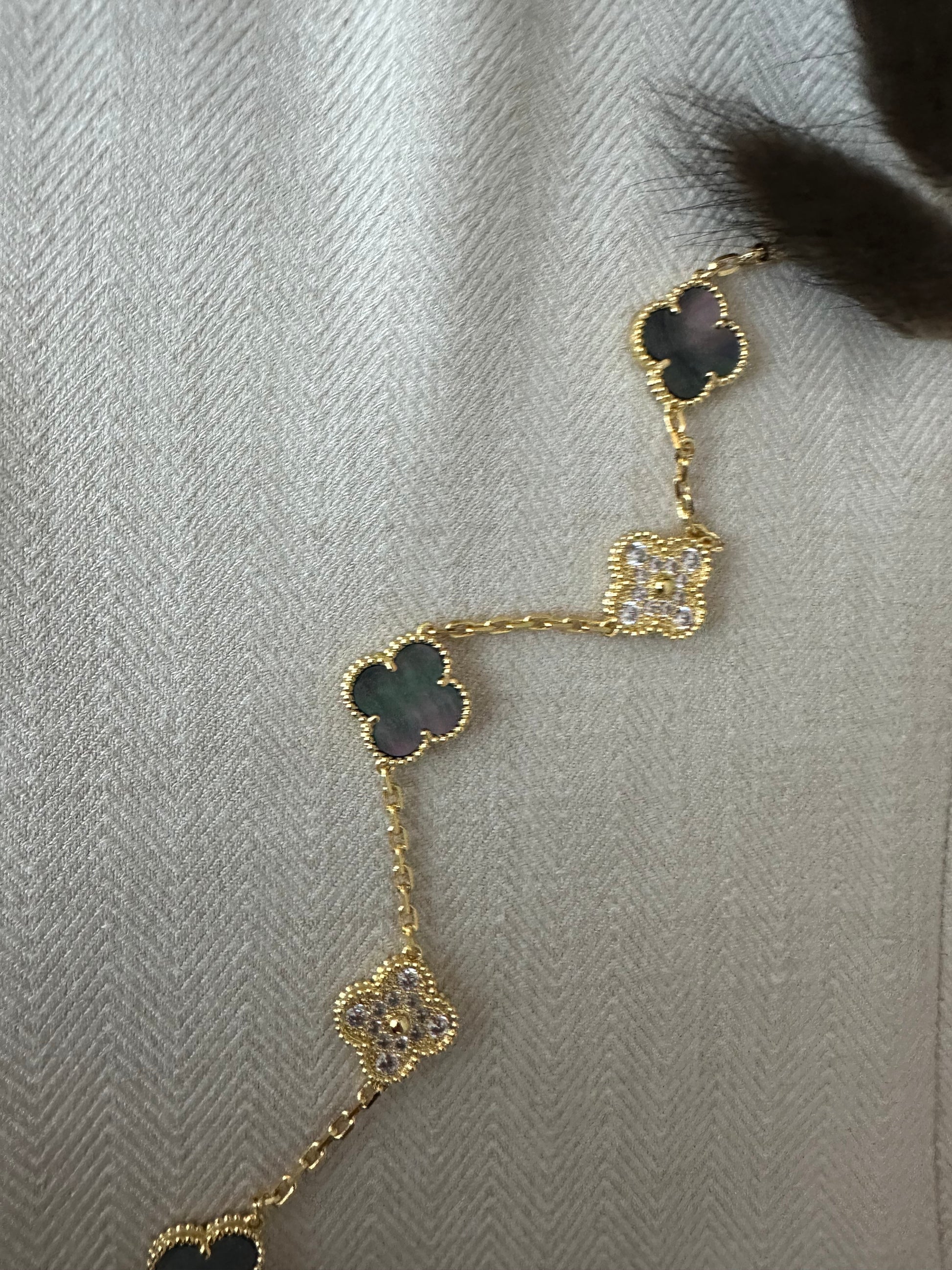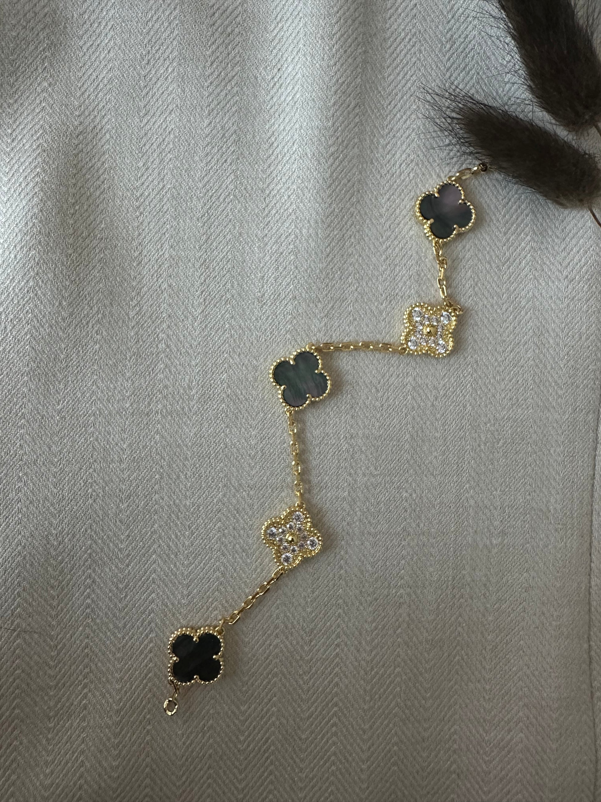 Elegant armbånd med smukke kløver i stilren grå nuance og funklende sten, der giver et eksklusivt og feminint look. Armbåndet er 19 cm langt og passer perfekt til både hverdag og fest. Et tidløst smykke, der er let at kombinere med andre smykker.